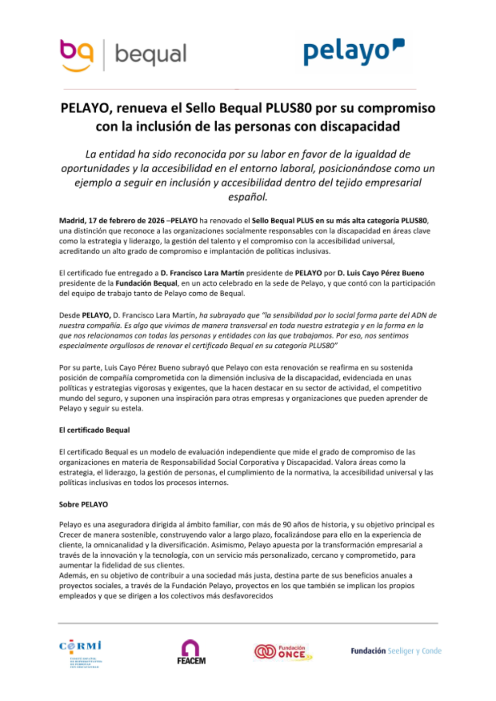 Pelayo renueva el Sello Bequal PLUS80 por su compromiso con la inclusión de las personas con discapacidad